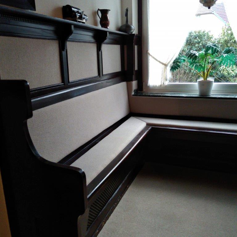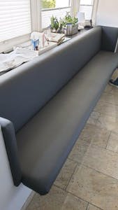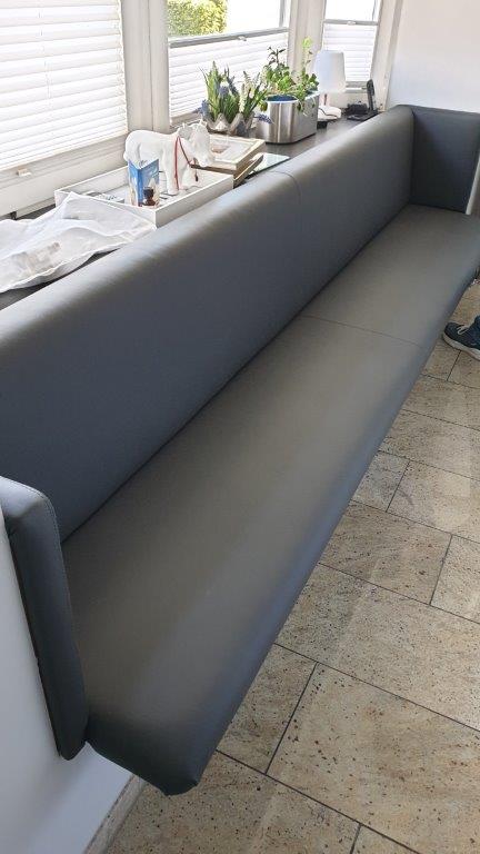 Für ein größeres Projekt gestaltete das Team eine komplette Sitzecke neu. Neben bequemen Polstern wurde auch die Wandfläche im Rückenbereich textil verkleidet – eine Kombination aus Gemütlichkeit und akustischem Mehrwert. Stoff, Farbe und Form wurden exakt auf das Raumkonzept abgestimmt – das Ergebnis: eine elegante Rückzugsecke mit klarer Linie und hohem Komfortfaktor. Polsterarbeiten und textile Gestaltung greifen hier perfekt ineinander.