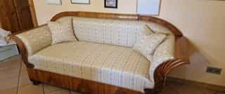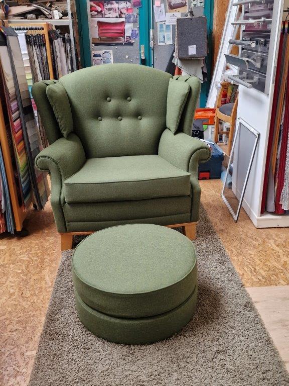 In einem weiteren Projekt wurde ein bestehender Sessel komplett neu gepolstert und bezogen. Passend dazu entwarf Raumausstattung Alberson einen runden Hocker, der nicht nur optisch, sondern auch funktional perfekt ergänzt: maßgefertigt, aufgebaut, gepolstert und mit dem gleichen Stoff bezogen. So entstand ein stilvolles, harmonisches Ensemble – ganz nach Kundenwunsch. Auch hier machten sorgfältige Polsterarbeiten den Unterschied.
