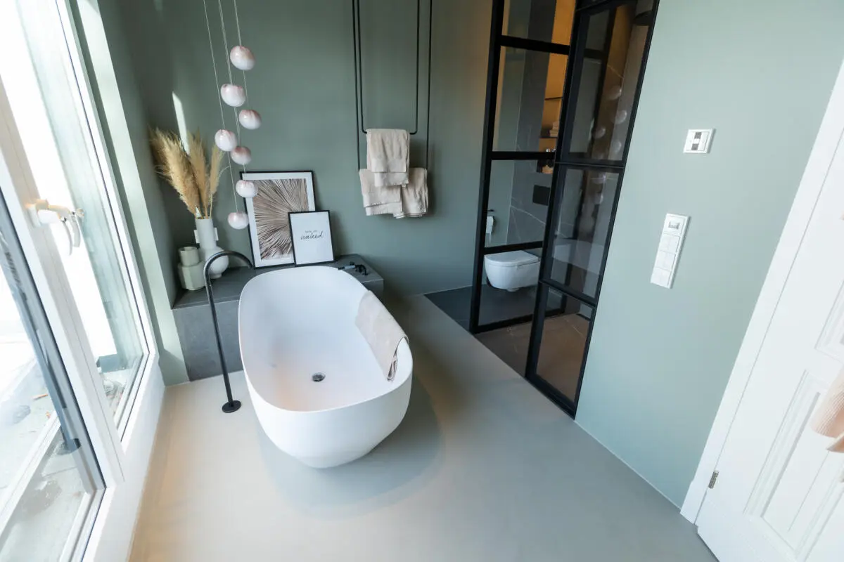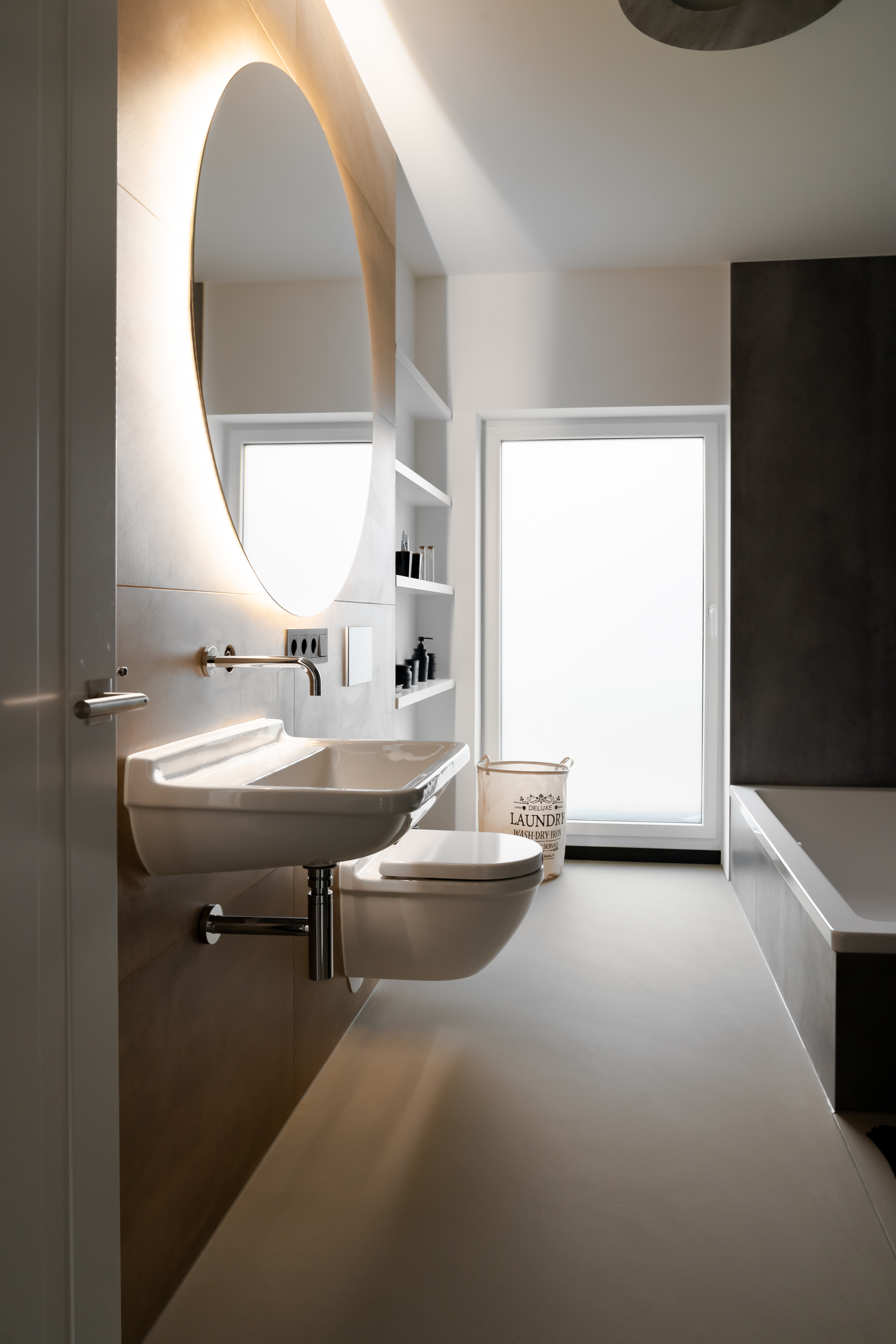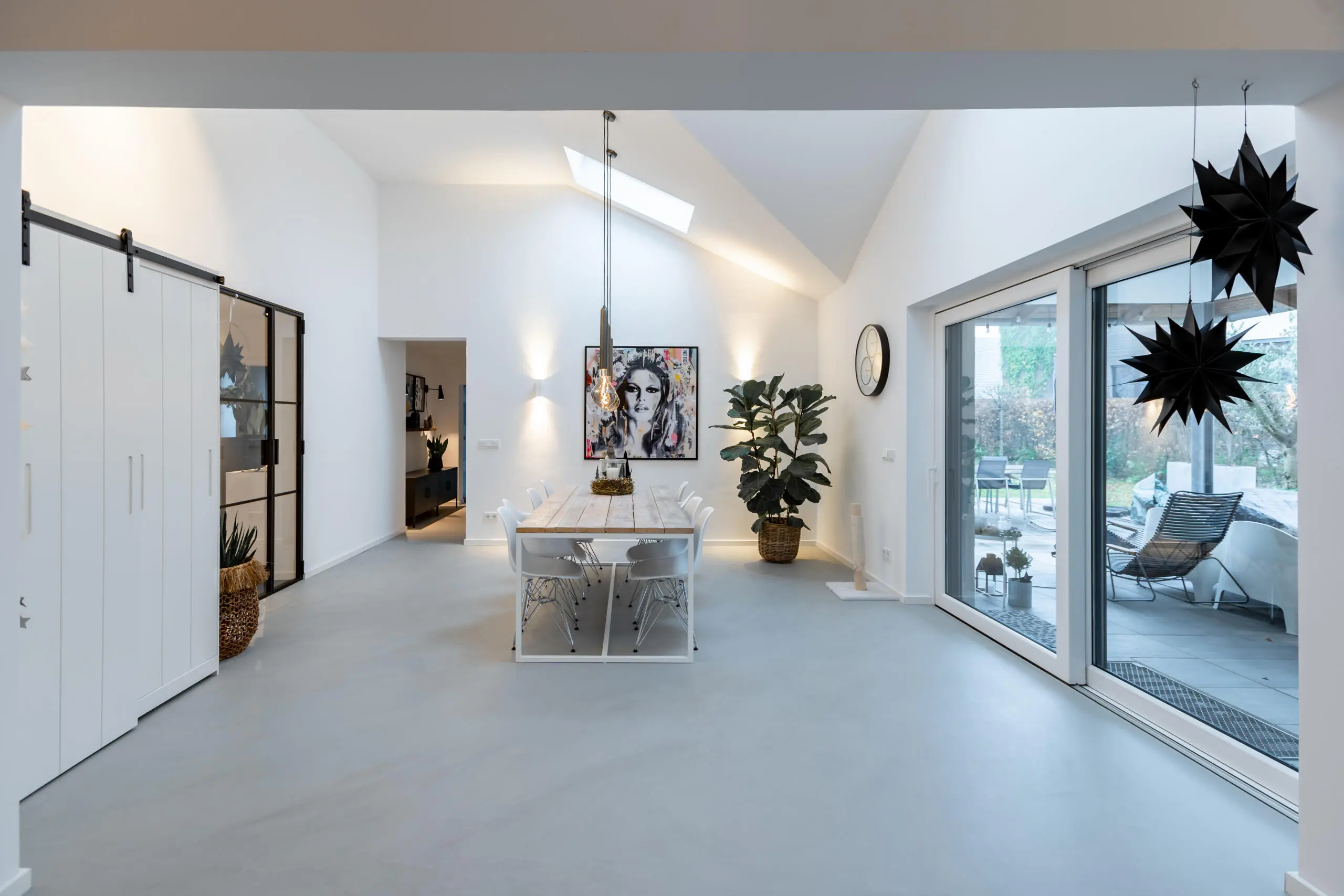 - Harmonisches Raumklima: Ein durchgängiger fugenloser Boden sorgt für eine ruhige und harmonische Raumwirkung, da er das visuelle Durcheinander, das durch unterschiedliche Bodenbeläge oder beispielsweise auch ein Fugenbild von Fliesen entsteht, vermeidet.
