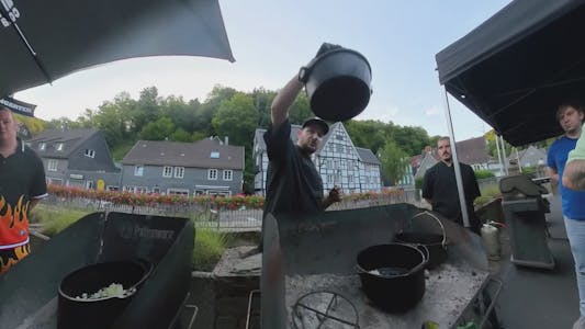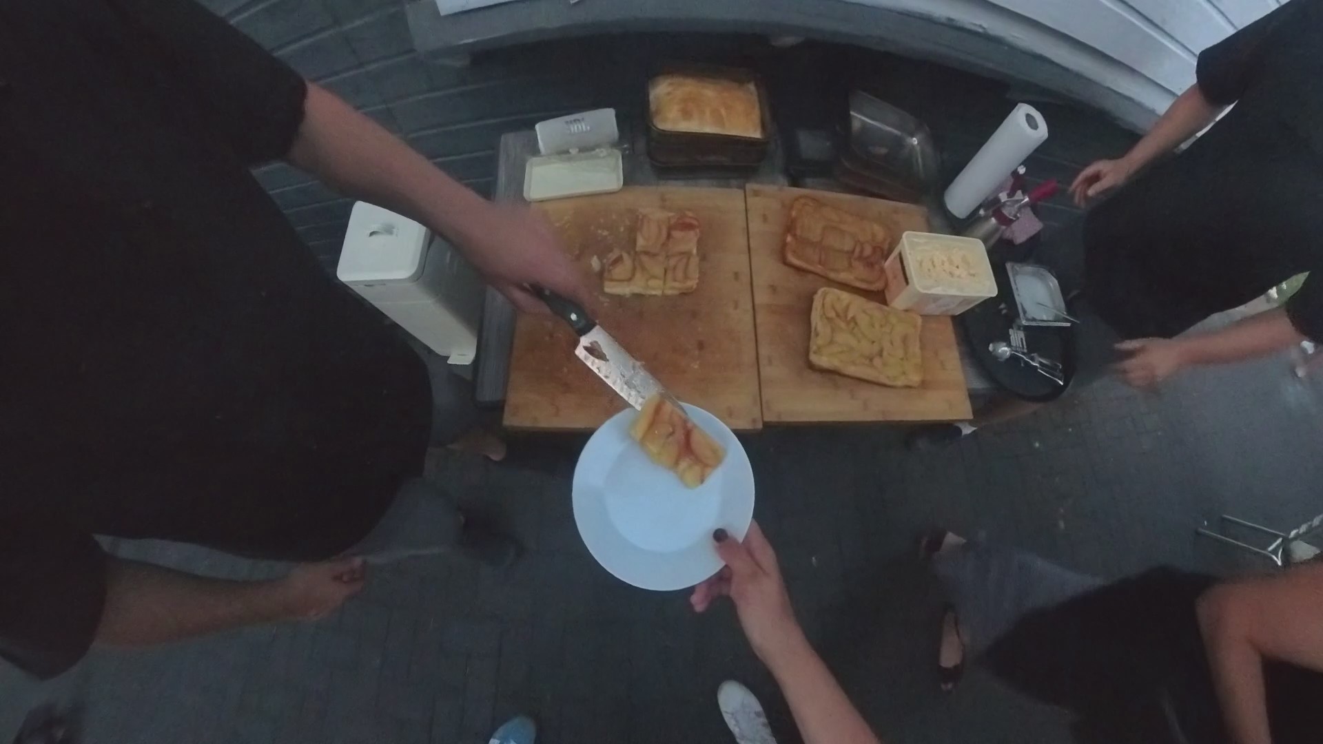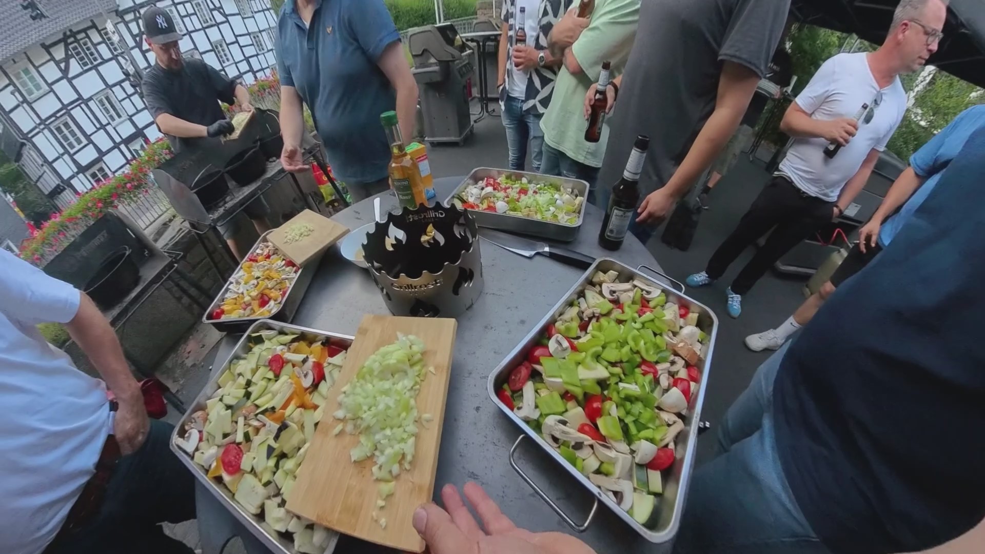 Los ging es mit einem herzhaften Flammkuchen als Appetizer. Es folgten Häckbällchen in Toskana-Sauce – wahlweise als vegetarische Variante mit gebackenem Camembert – dazu Knoblauch-Pilze und frisches Brot. Im Hauptgang wartete ein saftiges Flanksteak mit Granatapfel, gehobeltem Parmesan und Balsamico-Sauce auf uns. Alternativ gab es ein Veggie-Steak. Dazu wurden Folienkartoffeln mit Knoblauch-Dip und mediterranes Grillgemüse gereicht. Den süßen Abschluss bildete eine warme Apfeltarte vom Grill mit Sahne.